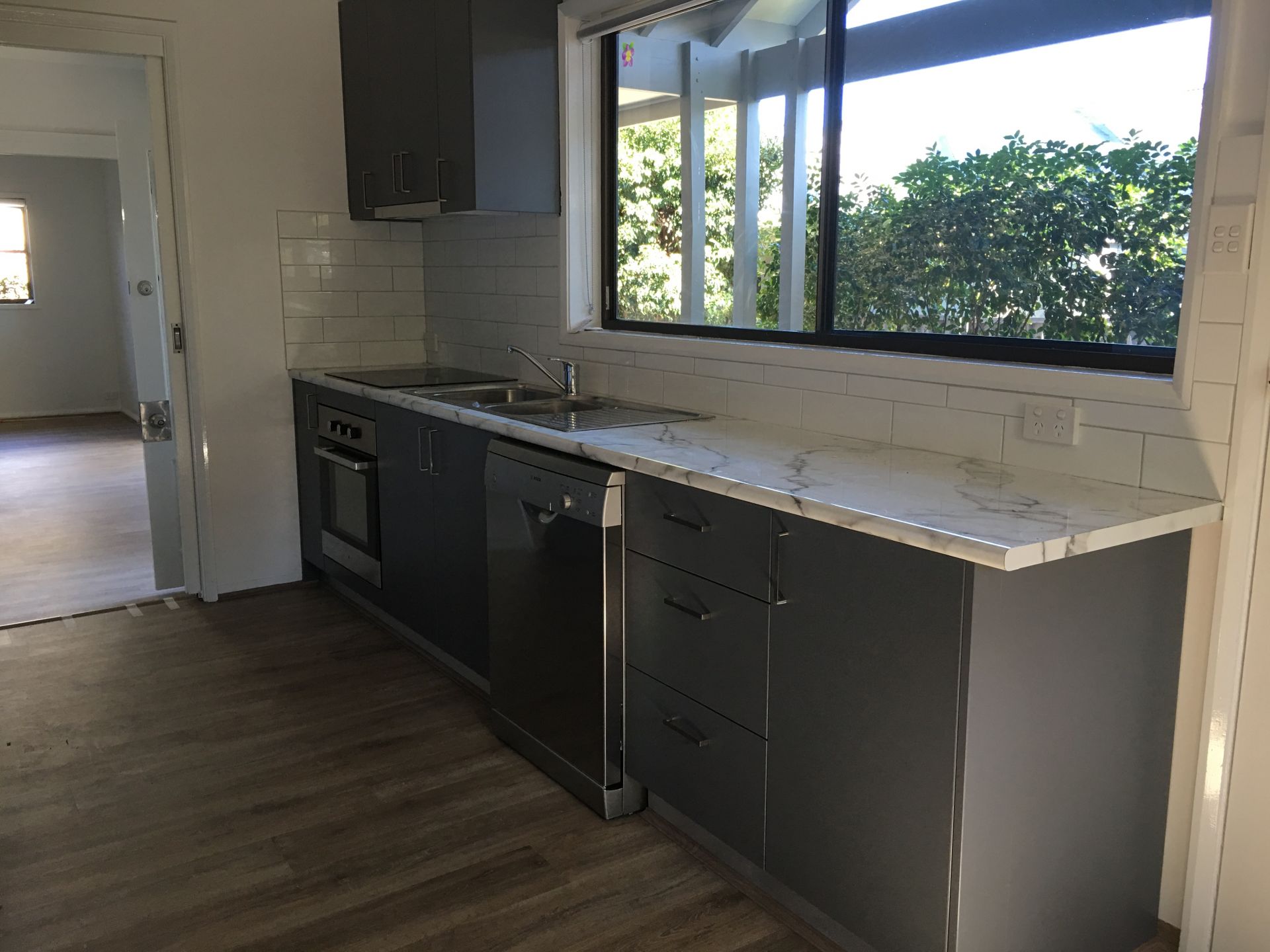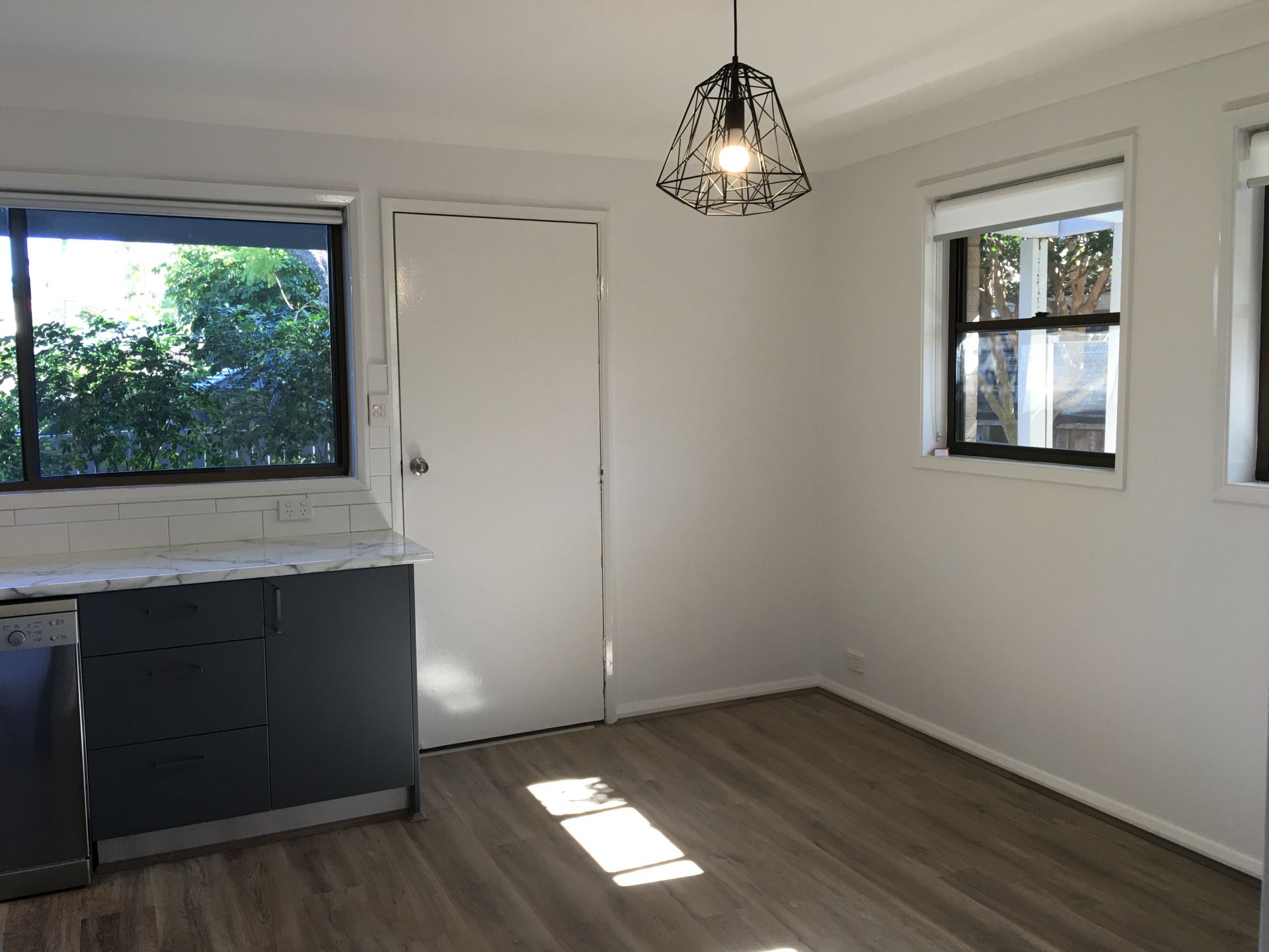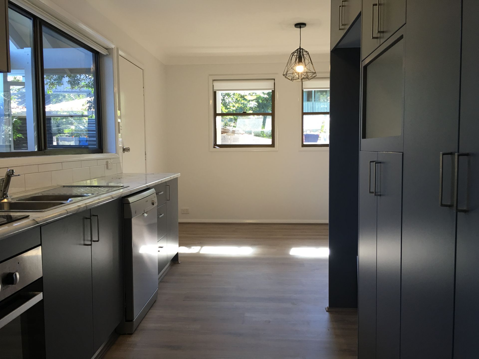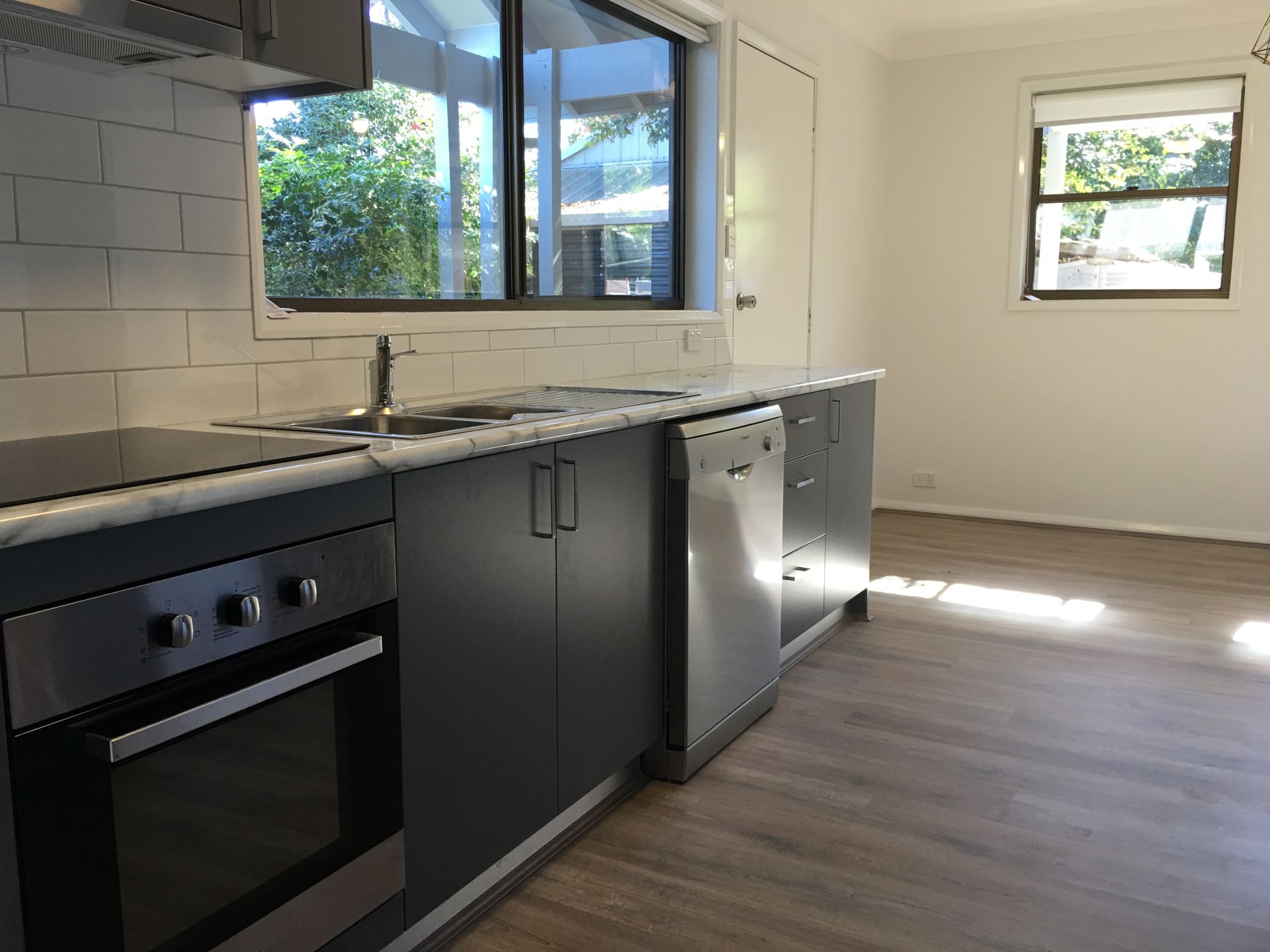 - Modern kitchen with dishwasher and dining area.