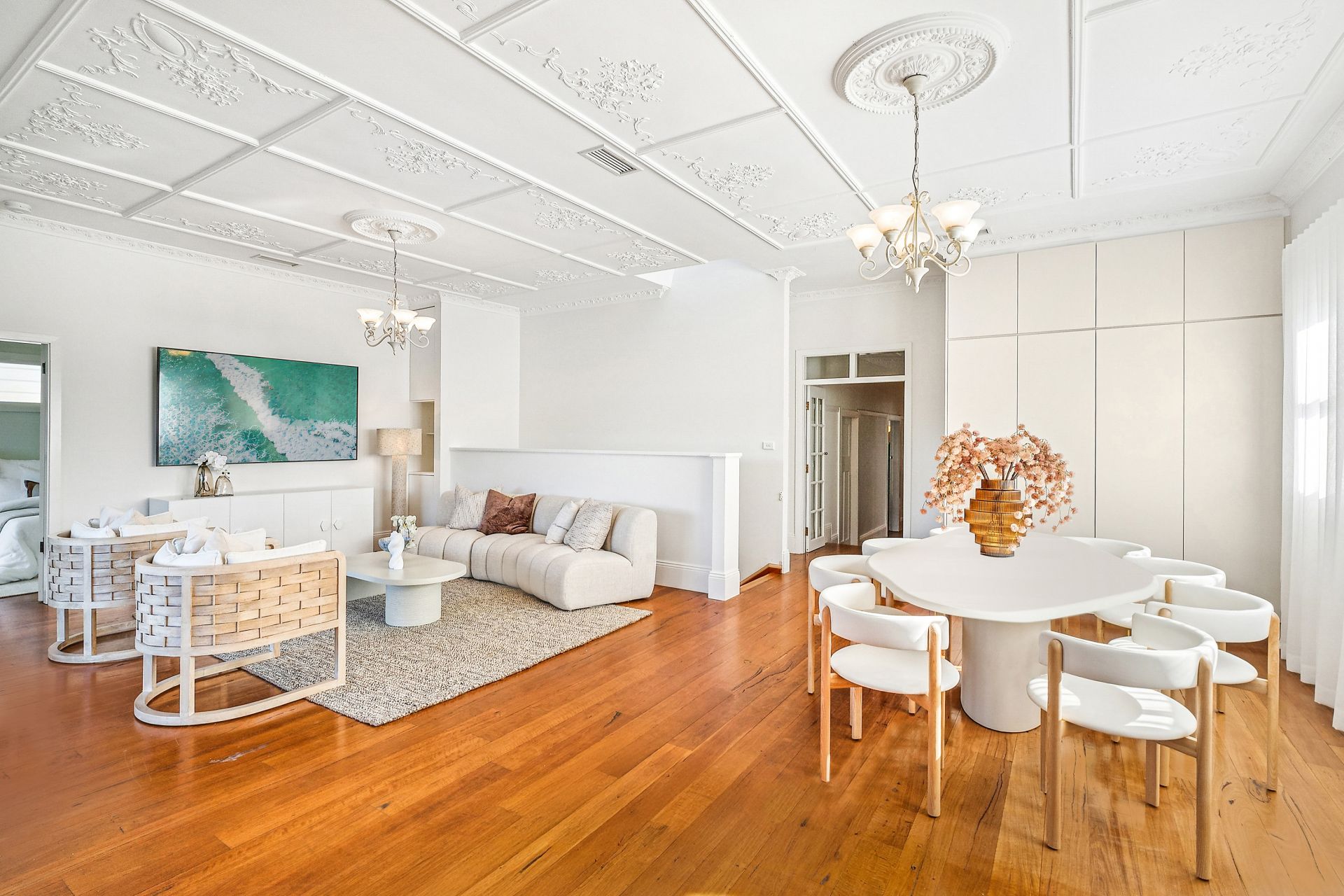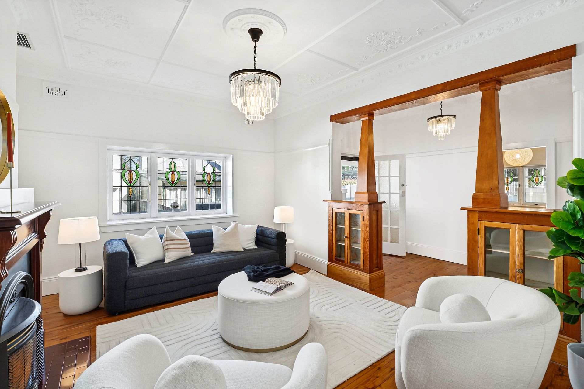 From the moment you enter, you are greeted by soaring ornate ceilings, wide hallways and rich timber floors that echo the craftsmanship of the 1920s, carefully preserved and enhanced for modern living. Stained-glass windows bathe the formal entry and living rooms, while the flowing layout offers a beautiful balance of traditional architecture and contemporary living.